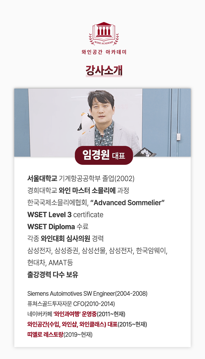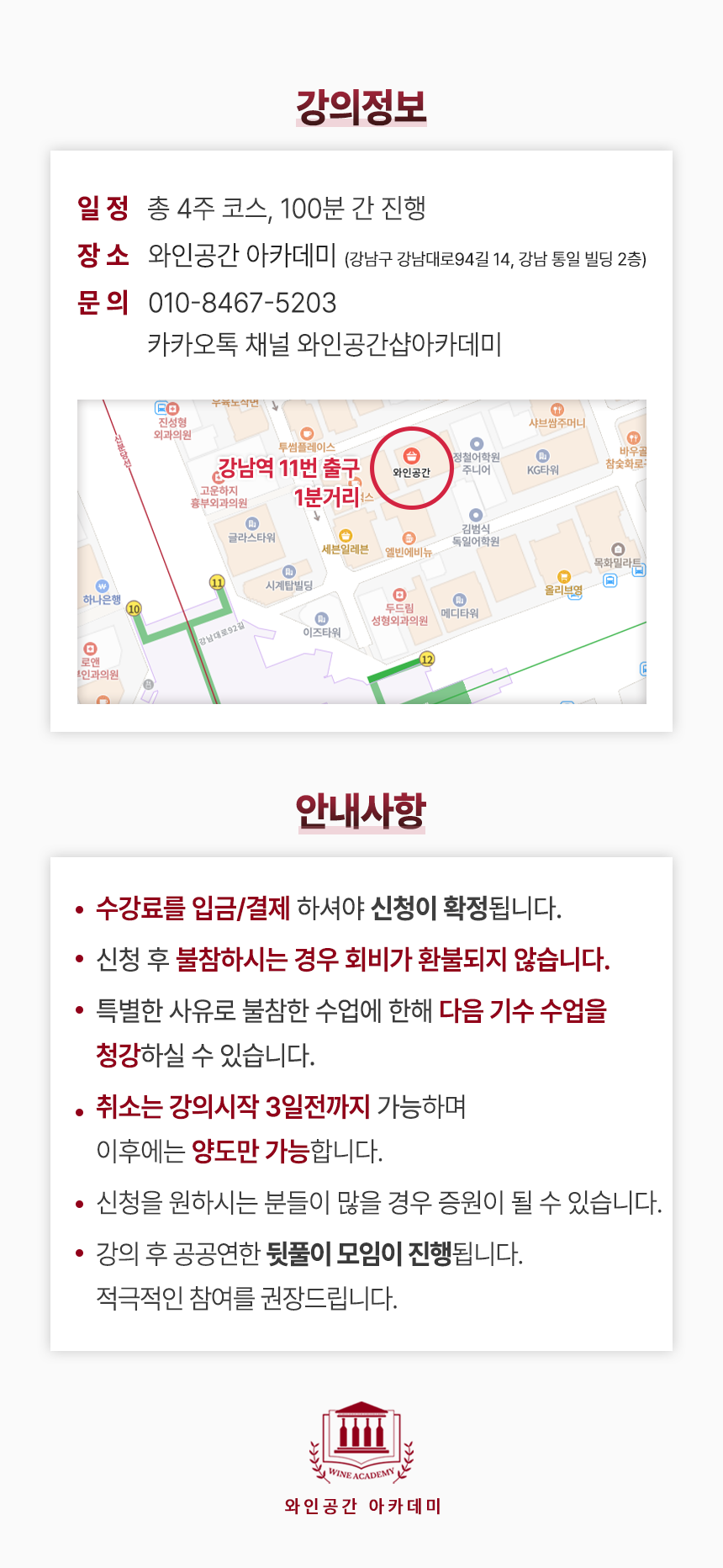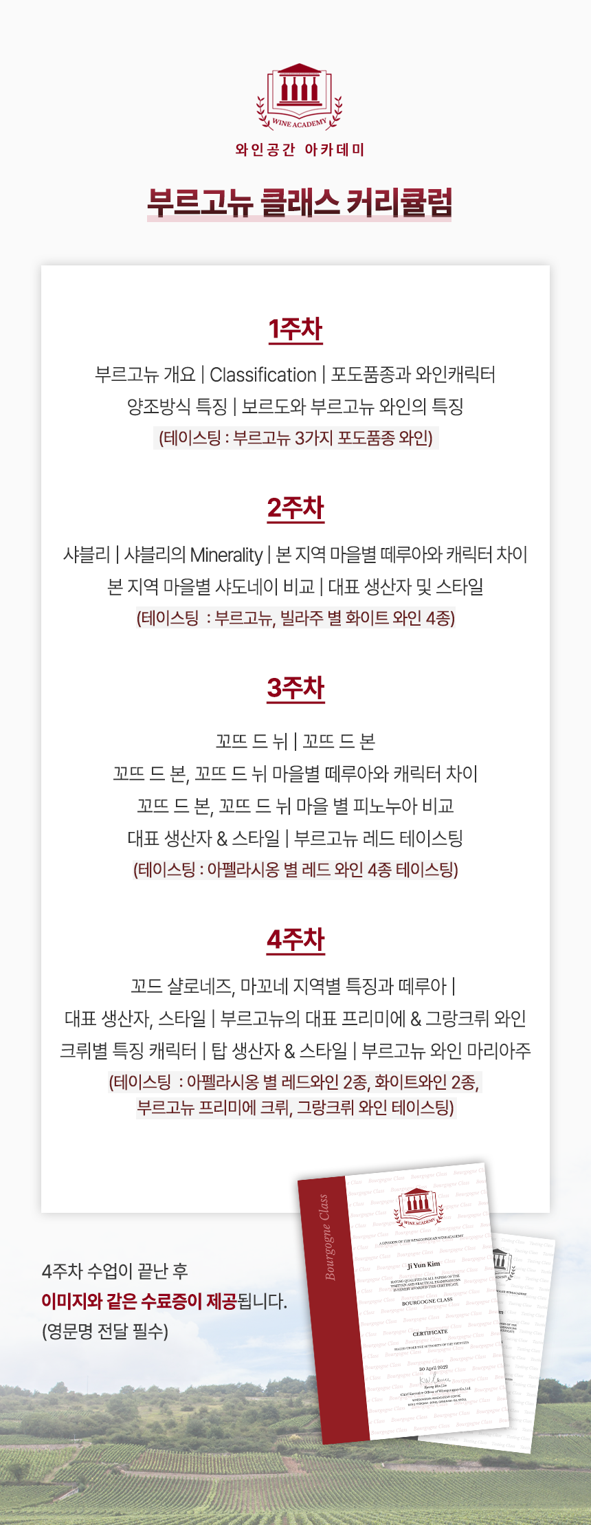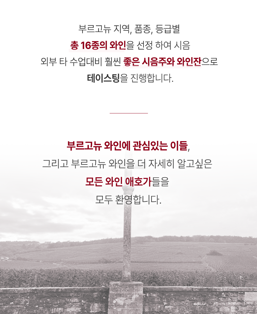 24% 부르고뉴 클래스 10기 ₩380,000 원래 가격: ₩380,000.₩290,000현재 가격: ₩290,000. 품절 수업일시 : 9월 2일, 9일, 16일, 23일 품절 Add to wishlist19세 미만 주문불가 - 미성년자의 경우 주류구매가 불가합니다.앱 결제시 주류 배송 불가 - 매장방문 결제시에만 배송이 가능합니다.픽업매장주소 - 강남구 역삼동 819-1 2층 와인공간카톡문의(클릭) Categories: Academy & Tasting, Wine Academy 설명 Specification 상품평 (0) 설명 0 / 5 총 0명이 리뷰를 남기셨습니다. 별 5개 0% 별 4개 0% 별 3개 0% 별 2개 0% 별 1개 0% 아직 상품평이 없습니다. Related products 36%Add to wishlistCompare보르도 특강₩200,000 원래 가격: ₩200,000.₩128,000현재 가격: ₩128,000.더 보기 품절 24%Add to wishlistCompare초중급 테이스팅반 90기₩210,000 원래 가격: ₩210,000.₩160,000현재 가격: ₩160,000.더 보기 품절 Add to wishlistCompare샴페인 클래스 38기₩330,000더 보기 품절
