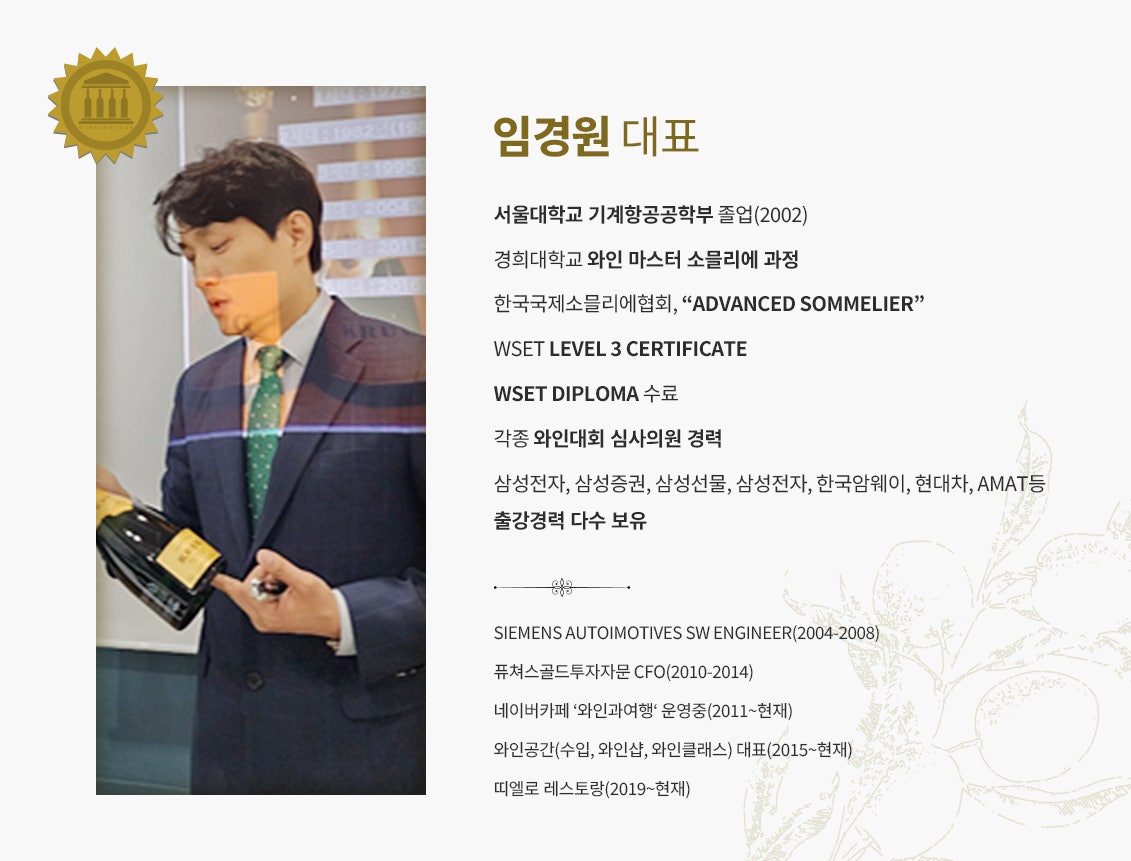 * 샴페인 수입사를 운영하고 있으며, 다수의 기업 와인 강의 및 심사 경력까지 갖추고 있는 전문 와인 강사이십니다.